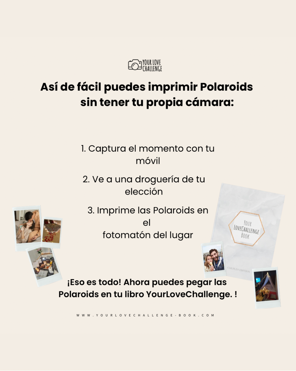 Por supuesto, puedes imprimir tus fotos digitales en formato Polaroid. Simplemente ve a una impresora fotográfica en una droguería en tu ciudad, conecta tu teléfono e imprime tus imágenes en "Formato Polaroid" para usarlas en tu libro.