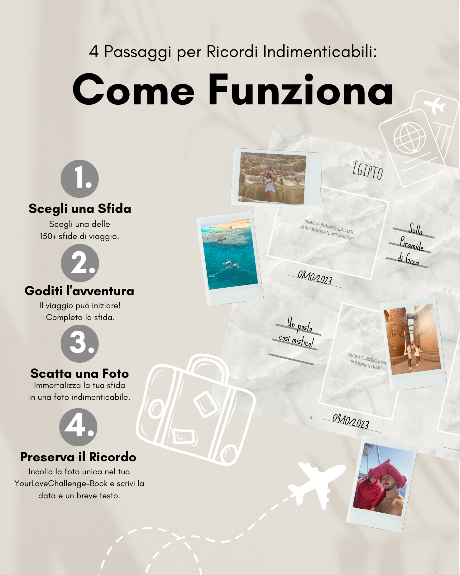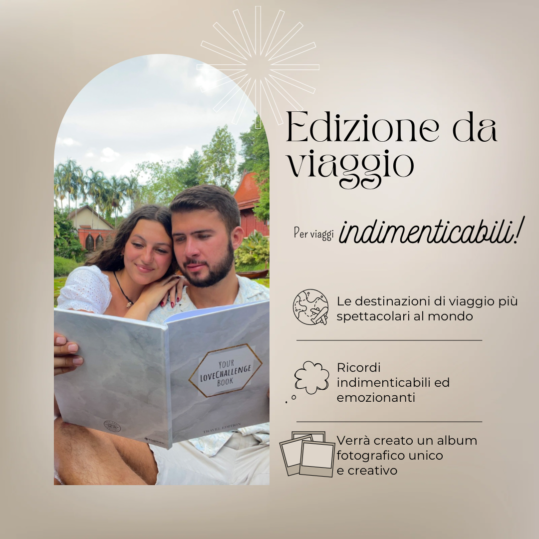 "L'edizione viaggio di YourLoveChallenge ha ravvivato le nostre avventure comuni e ci ha portato a idee totalmente nuove. Assolutamente indispensabile per ogni viaggiatore."
