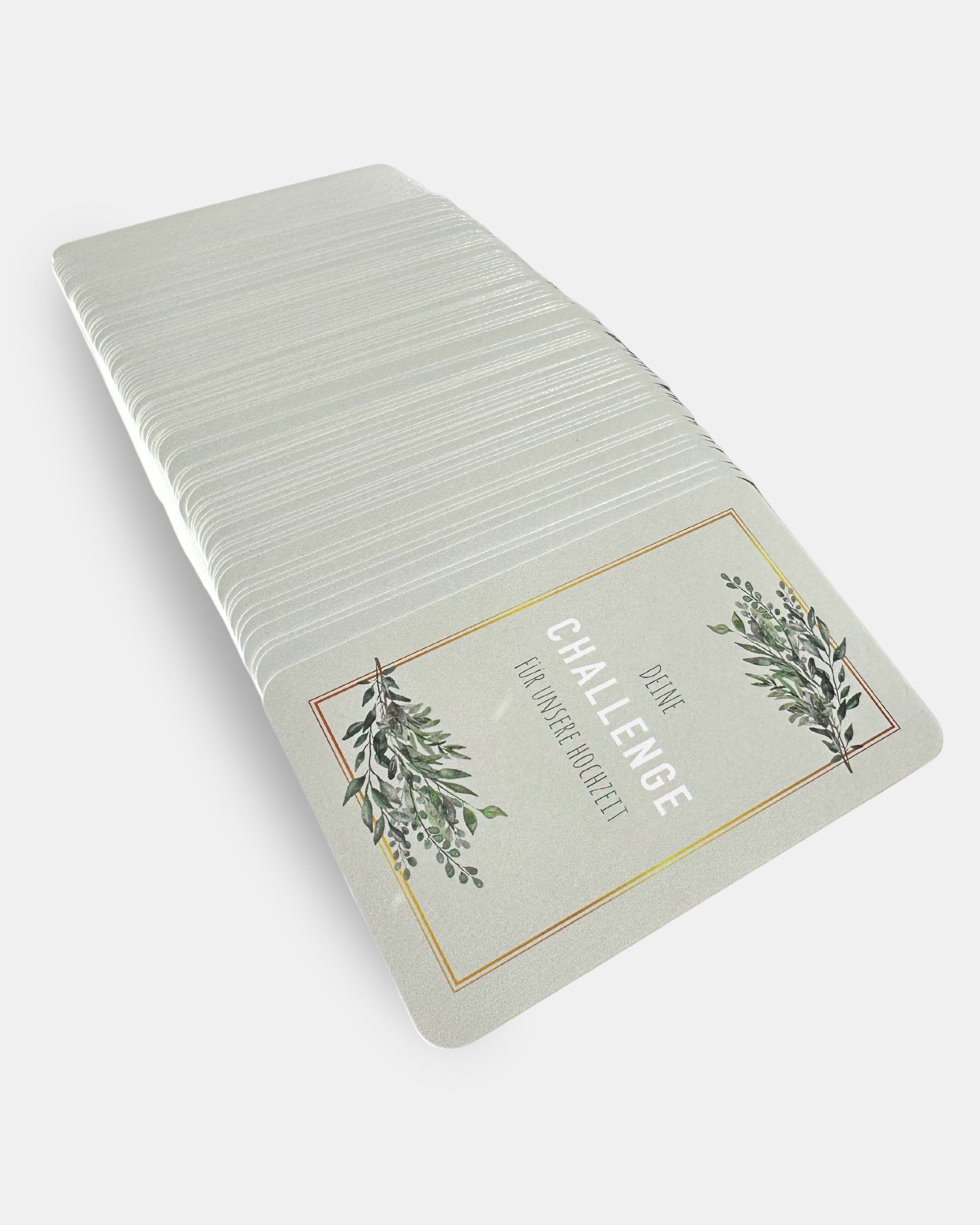 1. Die 100 Challenge-Karten werden am Anfang der Hochzeit verteilt, oder liegen bereits auf den Sitzplätzen der Gäste. Abhängig von der Gästeanzahl können bei zu wenigen Gästen einzelne Personen mehrere Challenges übernehmen, während bei zu vielen Gästen Paare oder Familien sich eine Aufgabe teilen können.
