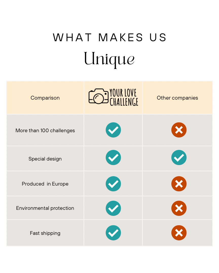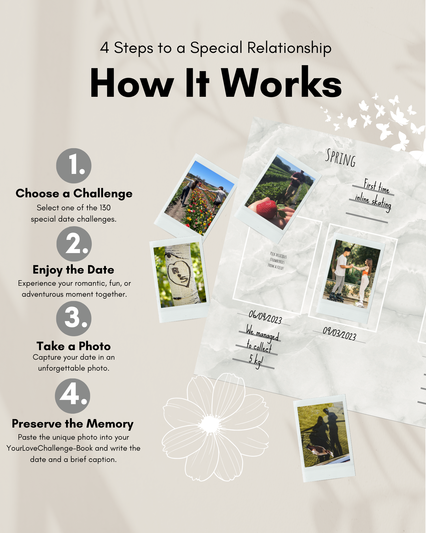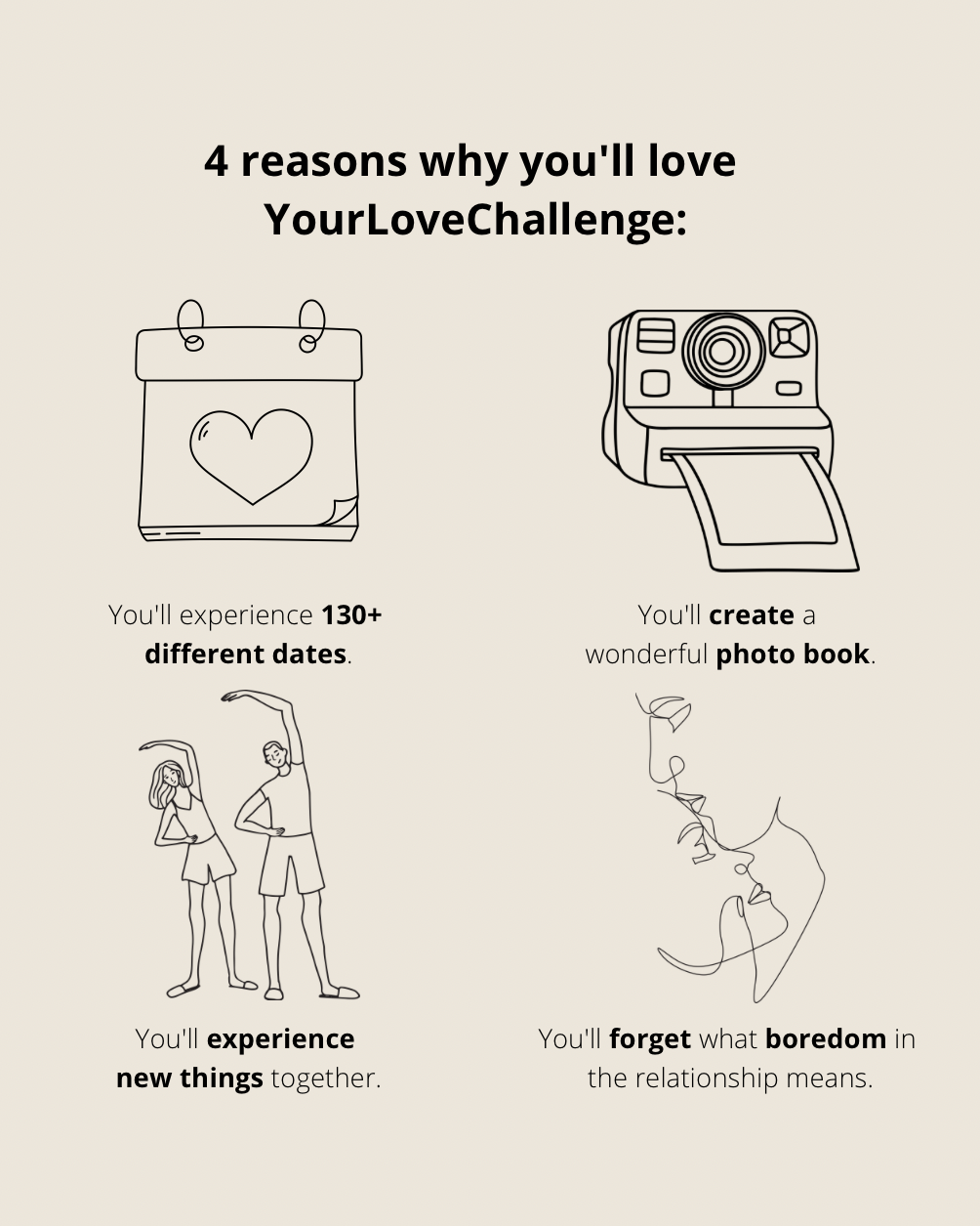 Welcome to YourLoveChallenge! Evelin and Daniel, the founders, offer you surprising dates and unforgettable memories – the secret recipe for the togetherness everyone desires. Our challenge books are packed with varied ideas to enrich your partnership and promote intimacy. Discover new facets together & create your memory book 💖