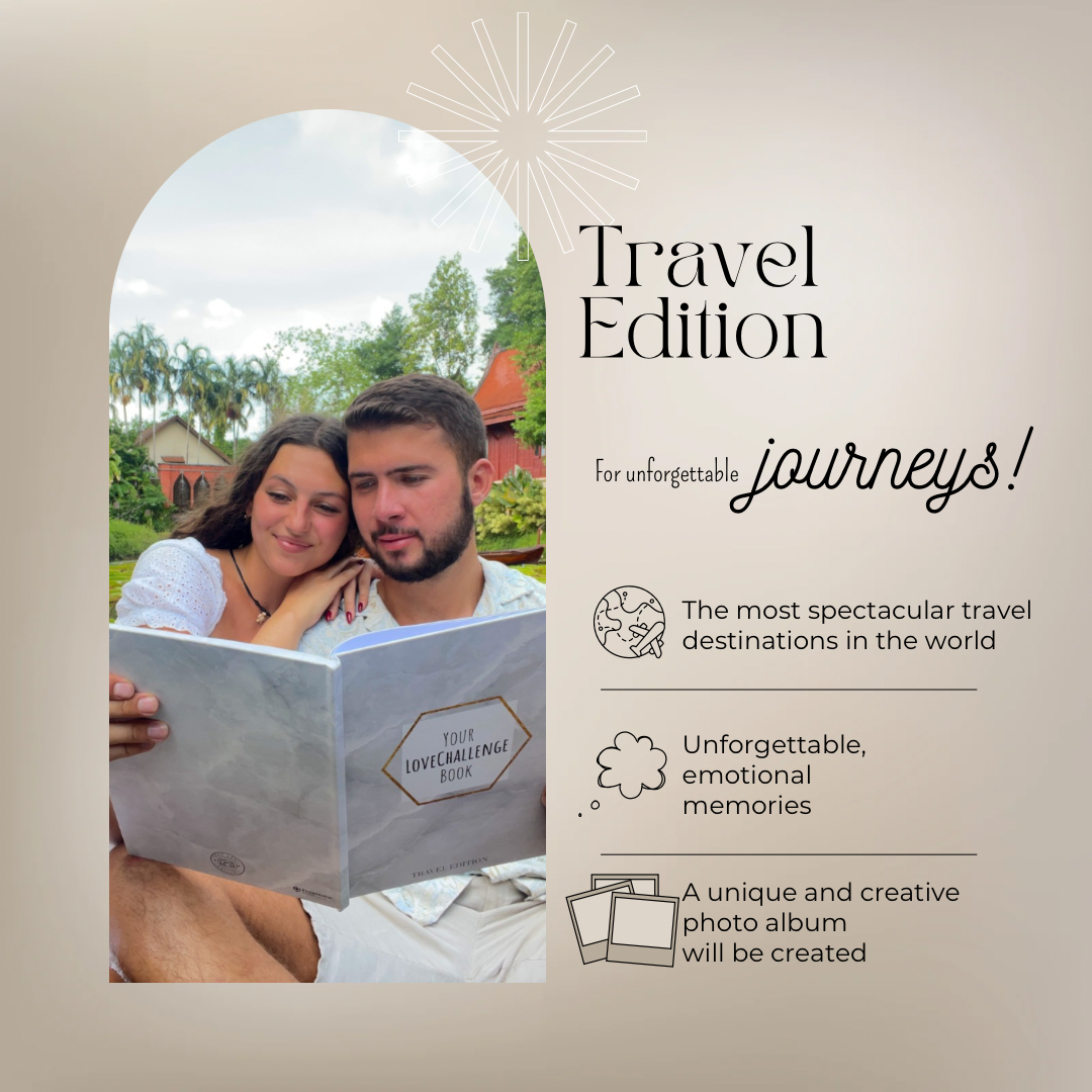 Welcome to YourLoveChallenge! Evelin and Daniel, the founders, offer you surprising challenges and unforgettable memories - the secret recipe for the travel adventure everyone desires. Our challenge books are filled with varied ideas to enrich your travel experience and promote shared experiences. Discover new facets together & create your memory book 💖